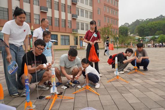 活动现场,茉莉小学上空航模穿梭、机影翱翔,赛场氛围热烈十足。橡筋动力飞机划出优美弧线,手掷滑翔机精准锁定落点,火箭载荷直冲云霄,无人机灵活穿越障碍。来自全市17个乡镇及6所县级直属学校的青少年选手同台竞技,在初级橡筋动力飞机留空计时、手掷滑翔机直线距离、火箭载荷、无人机障碍穿越等六大项目中激烈角逐。